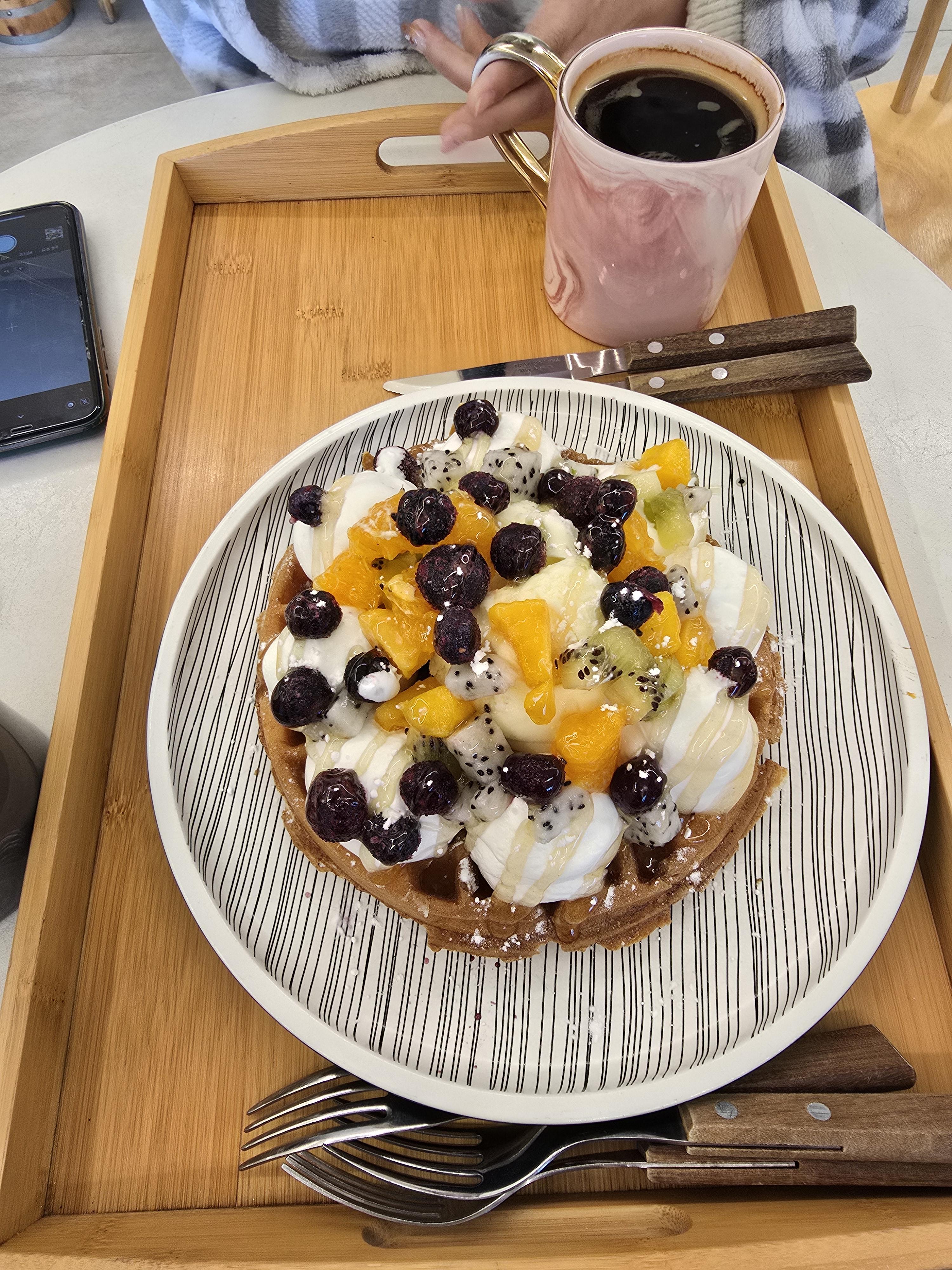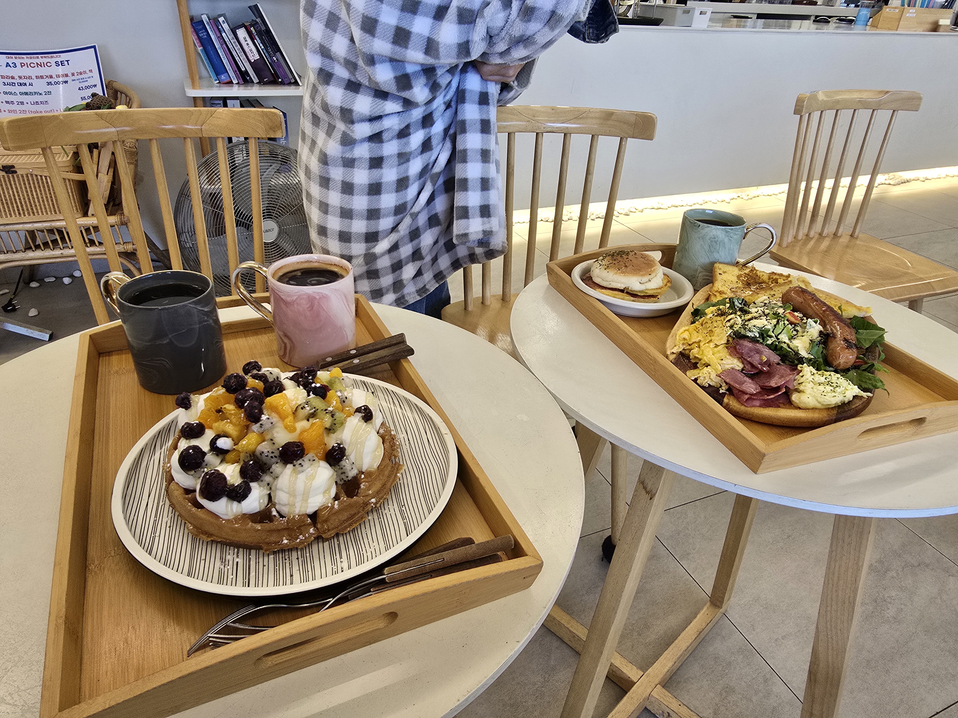 저희가 먹은건 과일와플,머핀,브런치에 커피가 빠질 순 없으니 핫아메리카노 석잔♡