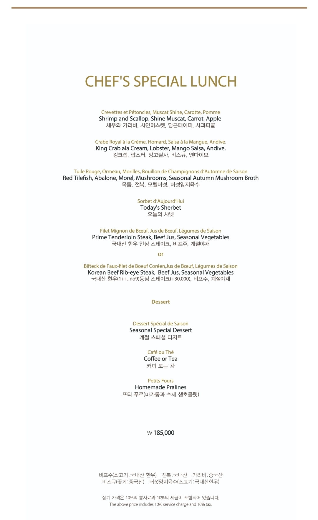 런치는 3가지 메뉴가 있는데 저희는 중간 단계인 CHEF's SPECIAL LUNCH 런치로 주문 했습니다. 가격은 후덜덜 하지만 사진으로 보시다시피 정성스러운 음식과 맛에 진심으로 아깝지 않은 금액이었습니다.