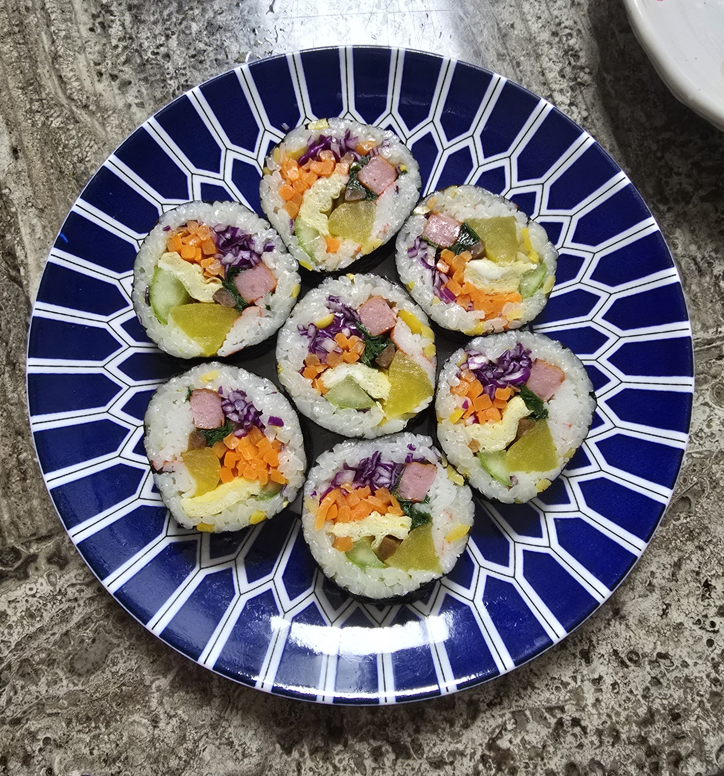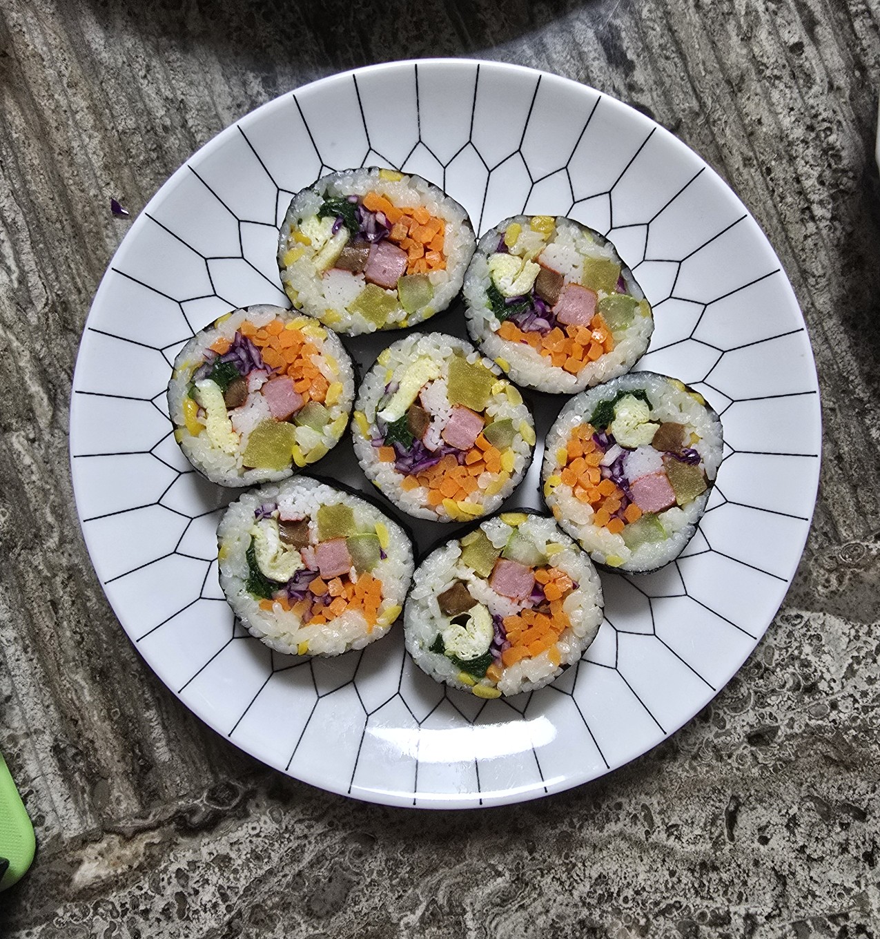 김, 밥, 루피니빈, 단무지, 우엉, 오이, 부추, 달걀, 당근, 적색양배추, 맛살, 햄