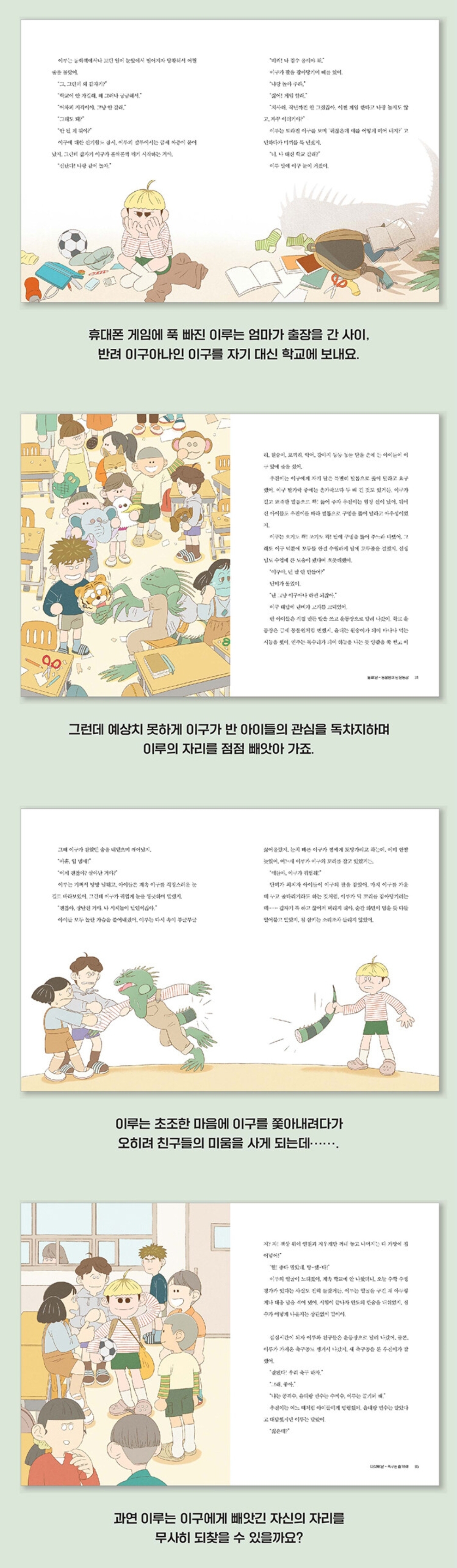 게임과 맞바꾼 등교, 이루 대타 이구의 등장! 어린이들이 흔히 하는 거짓말 중 하나가 있다면 “정말 딱 이번 한 판만 하고!”가 아닐까요? 좀처럼 믿기 어려운 이 말을 시도 때도 없이 남발하는 친구가 있어요. 바로 이야기의 주인공 이루예요. 이루는 ‘아마존 정글 배틀’이라는 휴대폰 게임에 푹 빠져 한 판만, 딱 한 판만 후딱 끝내자는 지키지 못할 혼자만의 약속을 늘어놓아요. 그러다 결국 학교에 지각할 위기에 처하게 되죠. 때마침 이루의 엄마는 해외 출장을 떠나고, 아빠는 바쁜 회사 일로 일찍 출근한 상황에서 이루는 몰래 땡땡이치기로 마음먹어요. 그런데 그때, 이루의 눈앞에 믿을 수 없는 광경이 펼쳐져요. 반려 이구아나인 이구가 이루에게 말을 걸어오는 게 아니겠어요. 이루는 평소 다른 이루의 모습이 신기하기도 했지만, 자꾸만 놀아 달라고 떼쓰는 이구를 보며 자기를 대신해 학교에 보내야겠다는 꾀를 내어요. 귀찮은 이구를 떼어 놓을 수 있으면서도 학교에 나가지 않아 혼나게 되는 상황을 피할 수 있는, 그야말로 절호의 찬스였죠. 그렇게 이루의 꼬드김에 홀랑 넘어간 이구가 신나게 학교로 향하고, 이루는 또다시 휴대폰 게임 속으로 빠져들어요. 앞으로 자신에게 다가올 고난은 전혀 예상하지 못한 채 말이에요.