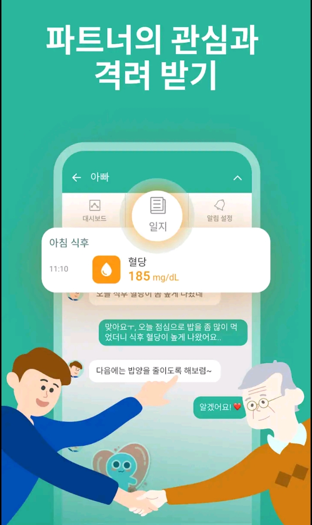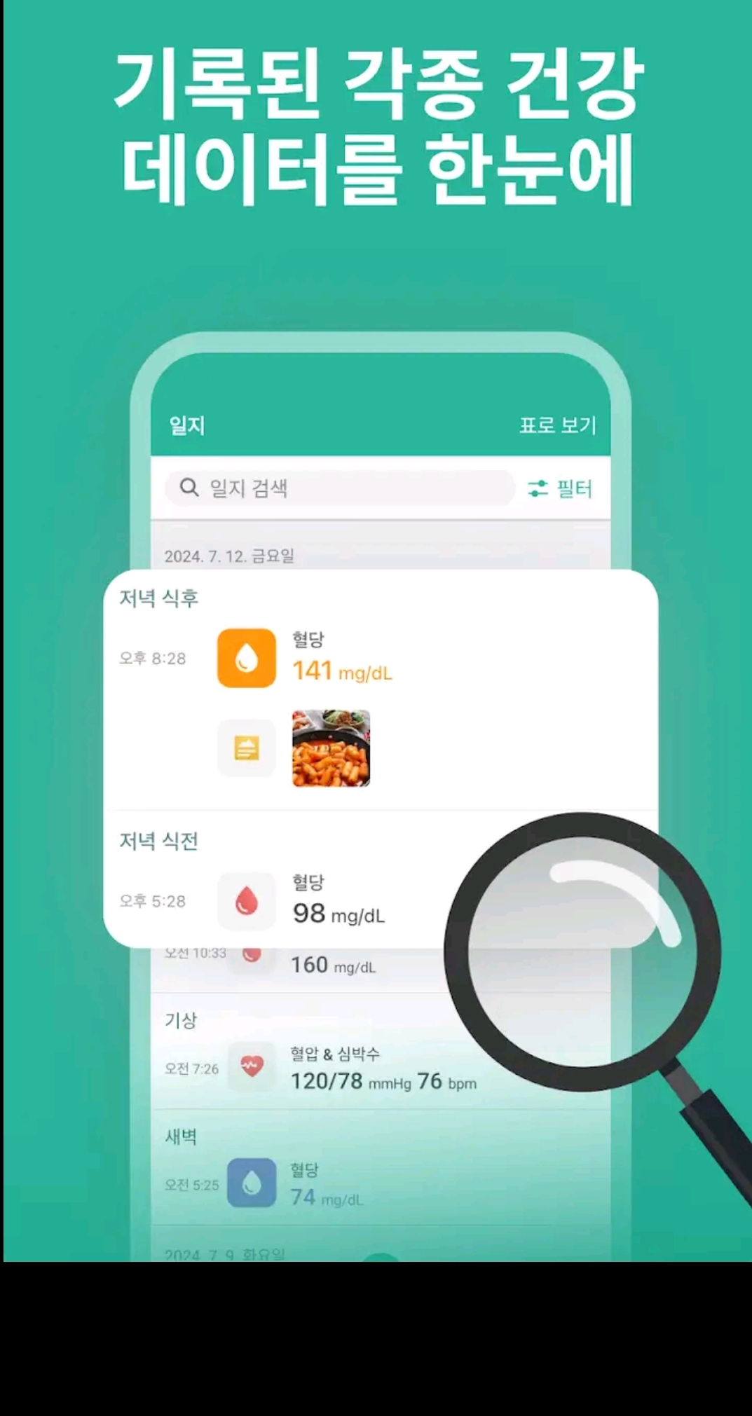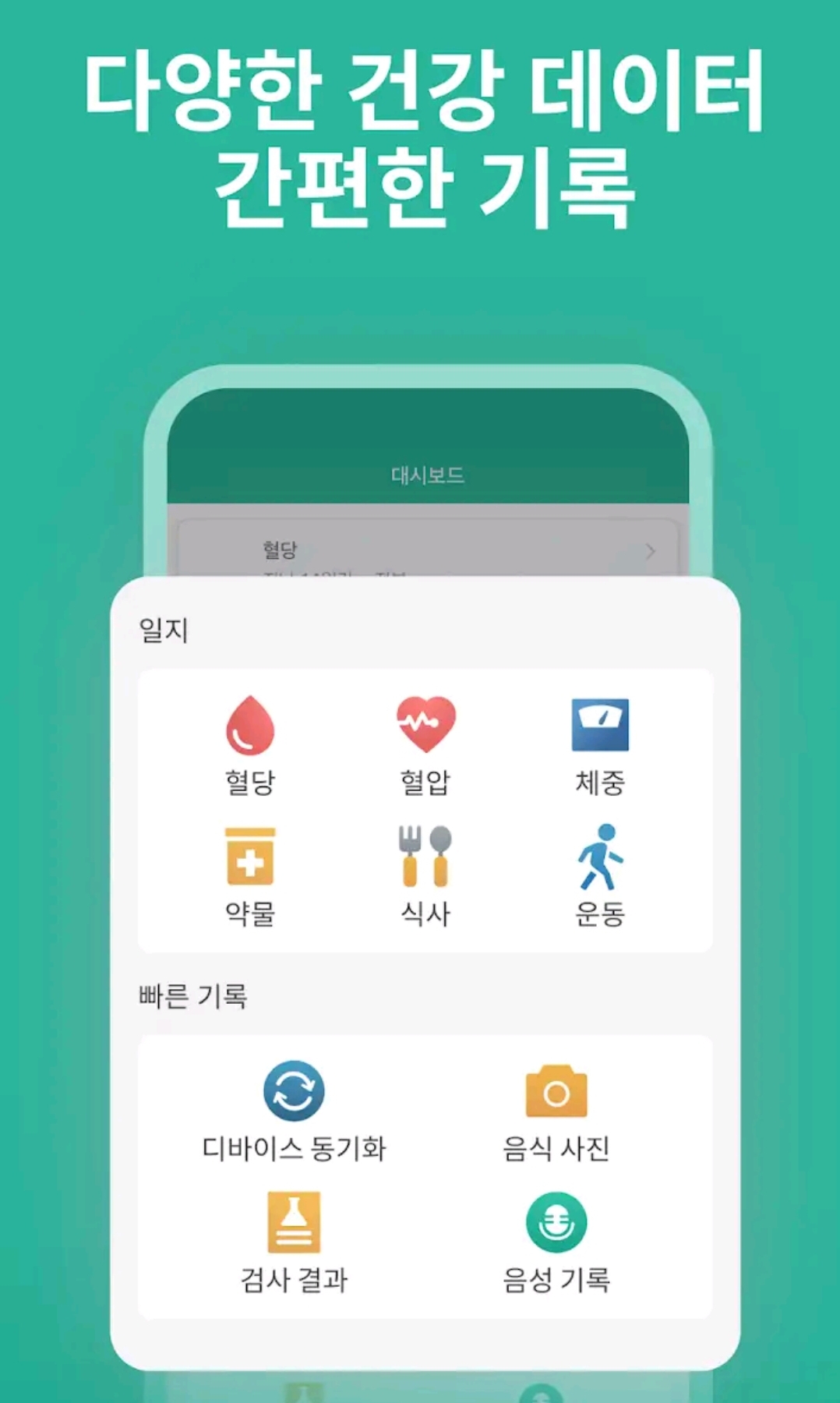 혈당 데이터를 한눈에 볼 수 있고, 건강 관련으로 기록도 가능하며, 측정기 동기화로 내 건강상태에 대한 격려와 도움을 받을 수 있어요.